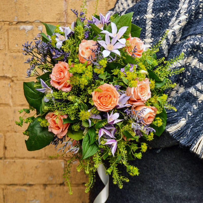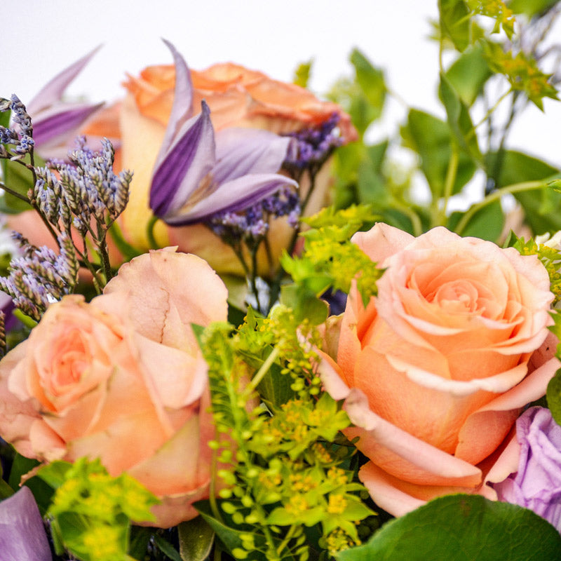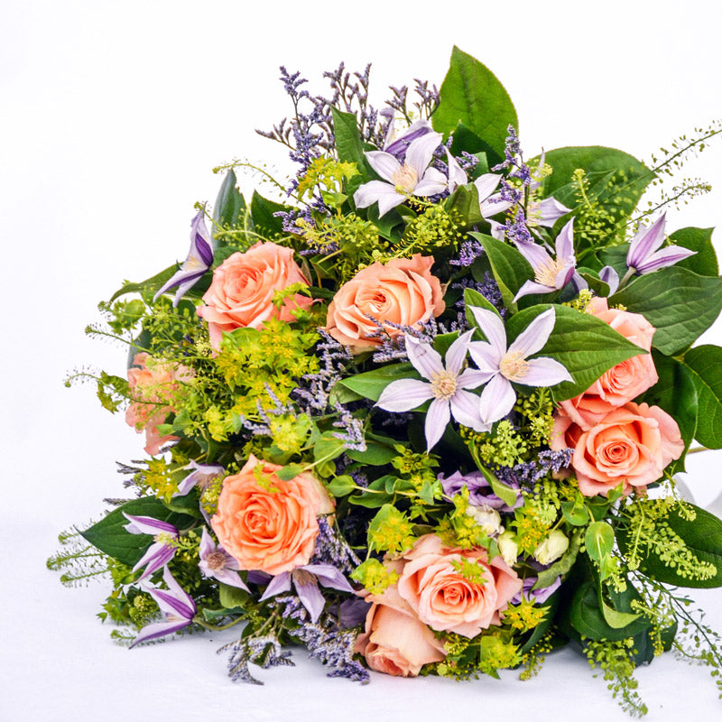 A truly inspiring bouquet. Peach Roses beautifully combined with purple clematis and lisianthus, solidago and greenbell. Pure joy for all senses. Free delivery for orders valued £100 or more. (Pictures display the regular size bouquet. Large size is approximately 25% bigger).