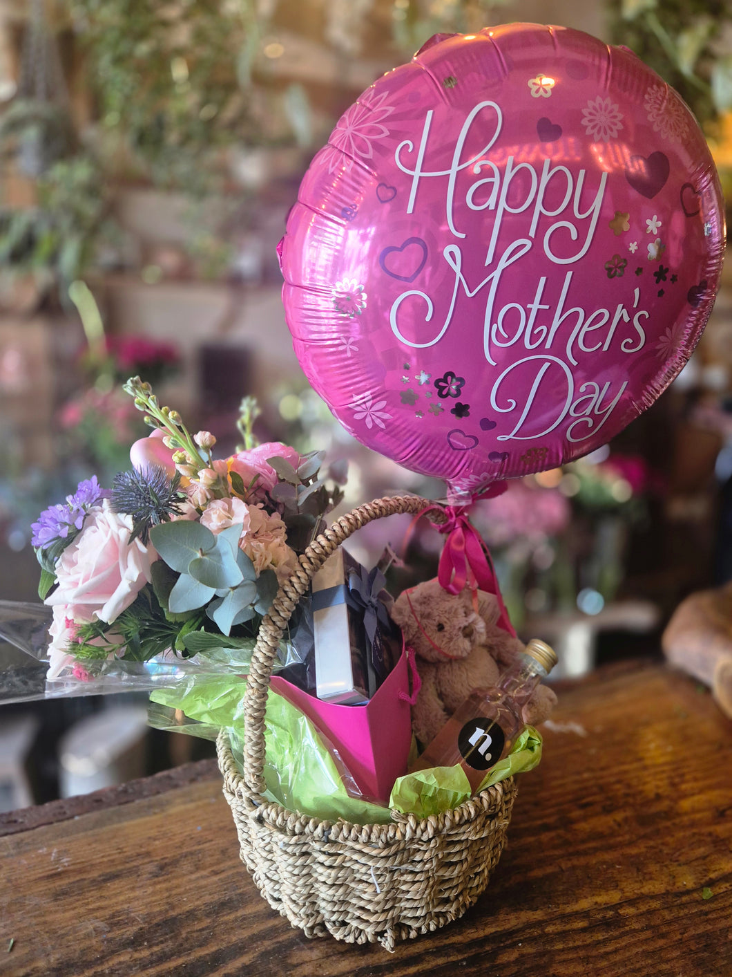 Mother's Day Hamper with Balloon, Teddy bear, Mocktail, Small Flower Arrangement, Chocolates, Balloon and mother's day card.